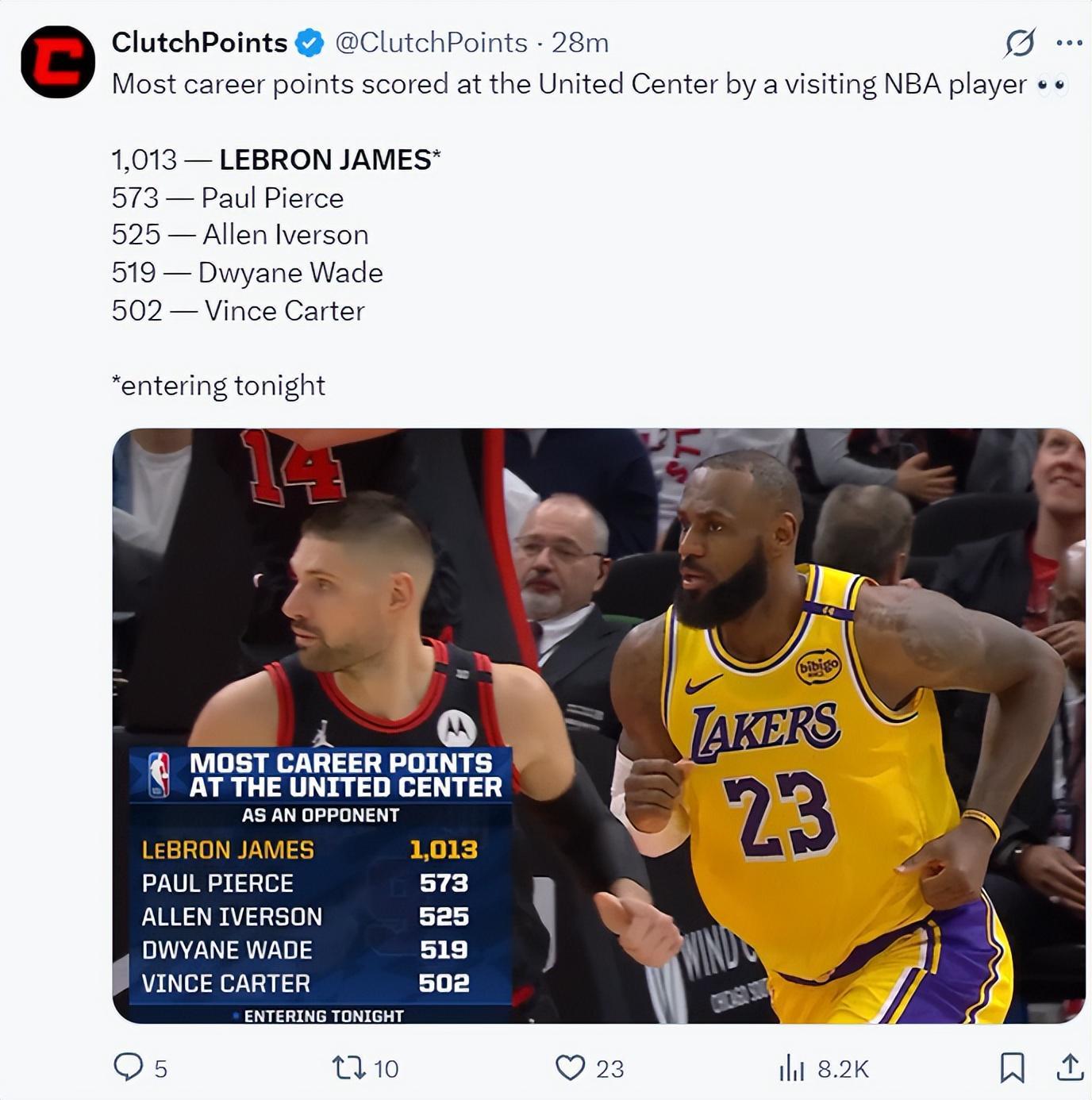 此役勒布朗也继续刷新历史首人纪录,在公牛球馆已经拿到1013分+是历史第一多。